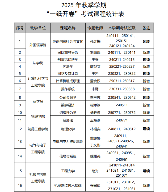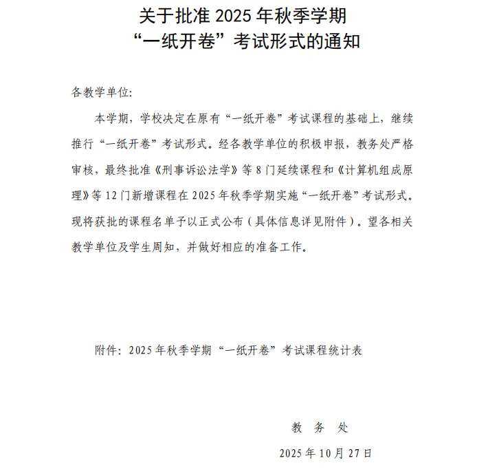 关于批准2025年秋季学期“一纸开卷”考试形式的通知